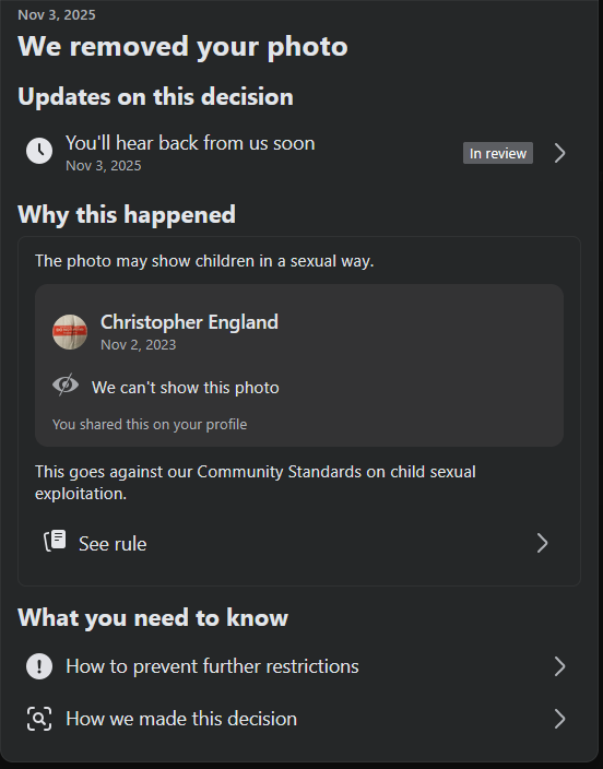 I was banned for 3 days in 2023 though, so I wonder if its the same fucking photo I challenged and (eventually) got overturned. Of course at the moment I can't remember what the fuck that photo was either.
