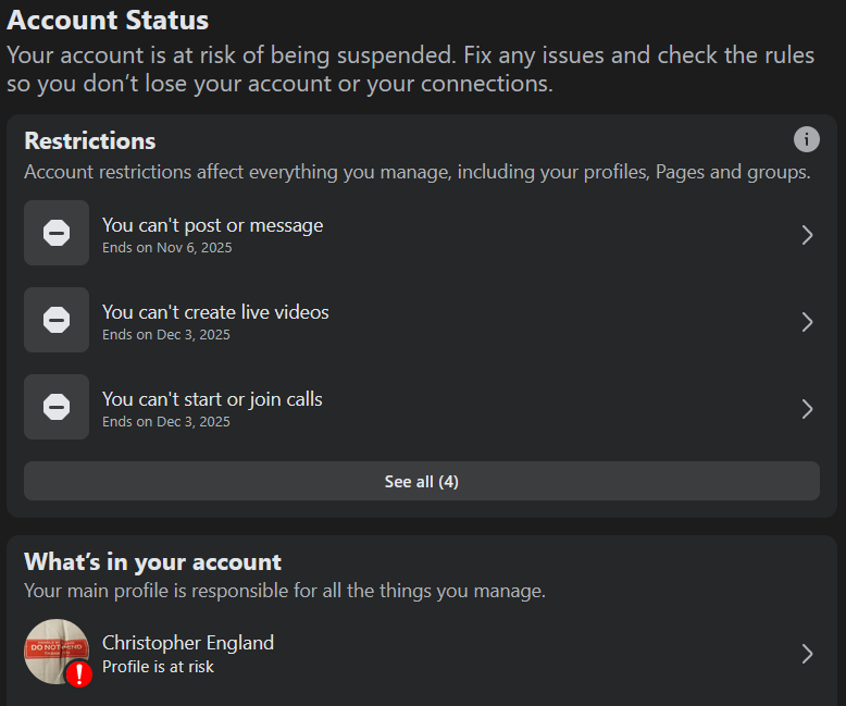 They banned me a second time, apparently for the same photo. Through November 10th from posting, and mid December for videos/calls.