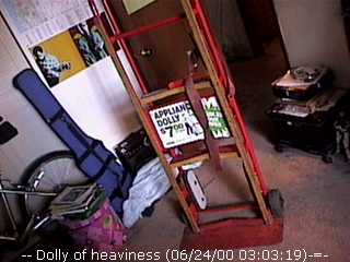Meet Dolly.. Dolly is going to help us pull off a little switch. Dolly came from U-Haul for 7 dollars a day.. Dolly was a bitch to fit in my car.. Dolly made me swear while I was loading her heavy ass into my car right off Sandy Blvd while cars where whizzing by me.. Dolly, is a special dolly, Dolly is designed to move appliances.. Like Fridgerators.. Our neighbor who stored our food, has a wonderful fridge.. It even.. Get this.. It's gonna be a shocker.. KEEPS THINGS COLD! None of this alittle colder than room temp stuff like ours.. It actually keeps things cold! Since they are moving out, during the move we plan to pull the ol' switcheroo of fridges and none will be the wiser.. err.. I hope..